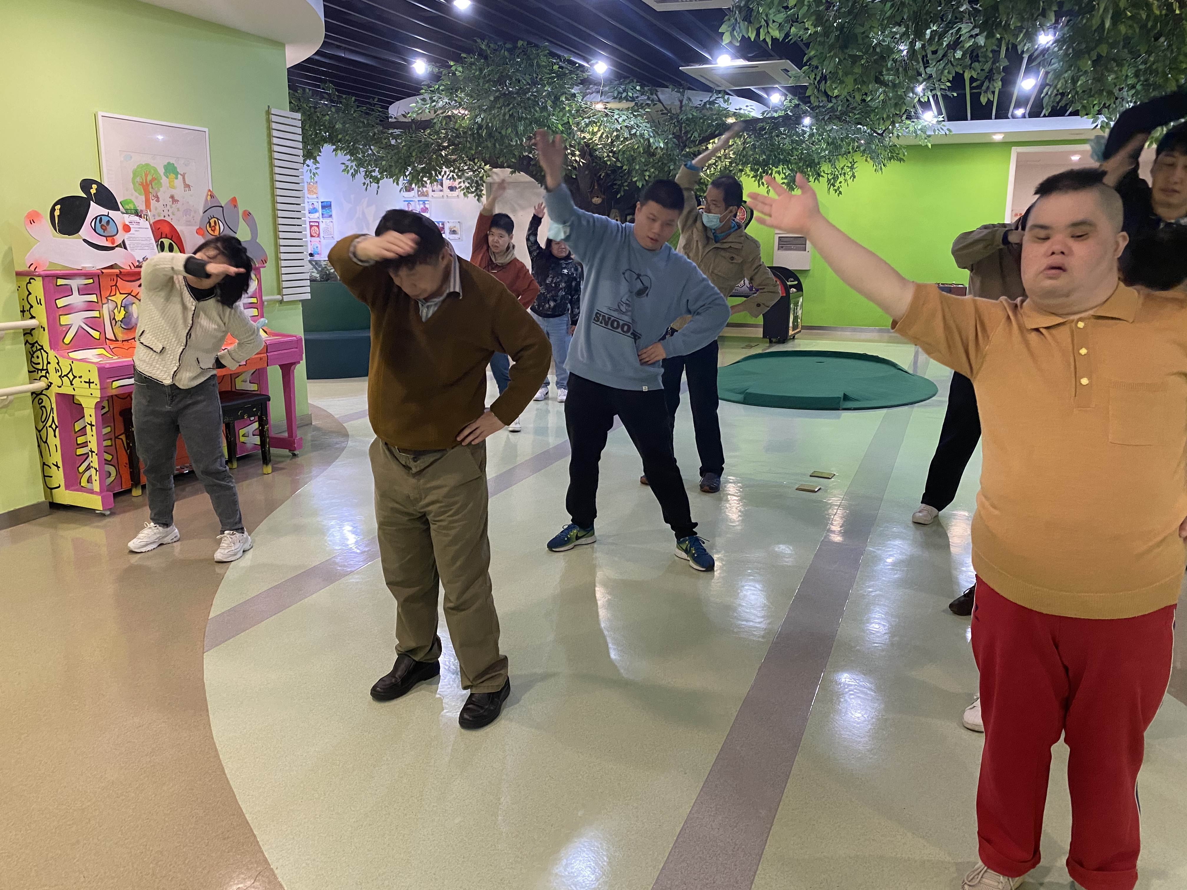 为了丰富“阳光之家”学员的文体生活,提高他们的身体素质,2025年10月27日下午,石门二路社区体育健身俱乐部的教练前往石门二路街道辖区内的“阳光之家”,为学员们精心策划并组织了一场妙趣横生的康复训练活动。