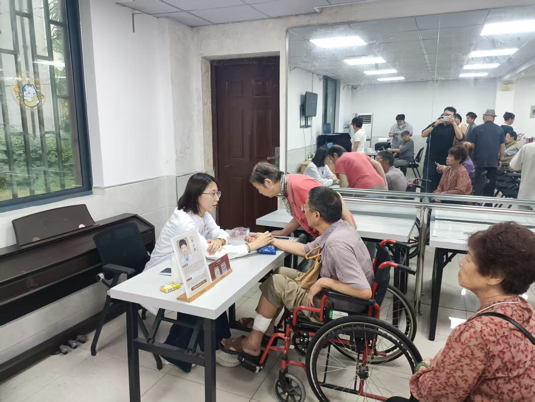 讲座结束后,北京同仁堂的医生们迅速在现场摆开诊台,为居民们提供一对一的把脉问诊服务。居民们有序排队,依次就座,医生们则全神贯注地为每一位居民搭脉、观察面色、询问症状。