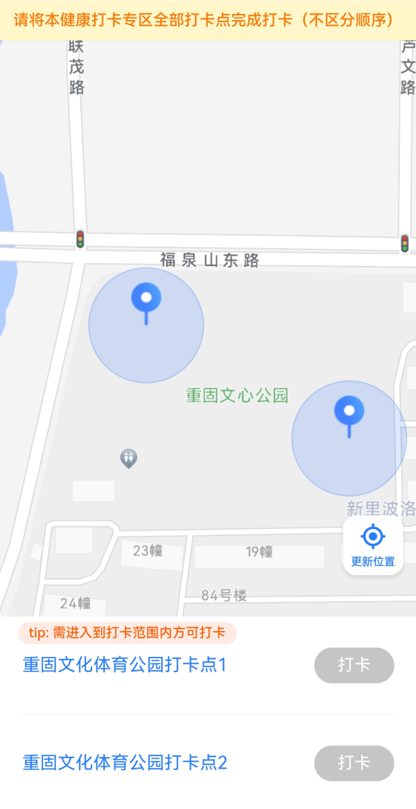 方式:每日,前100名居民在公园健步走,经过打卡点时,打开定位,轻松扫码,点击打卡,即可获分。