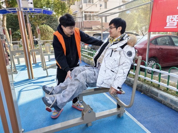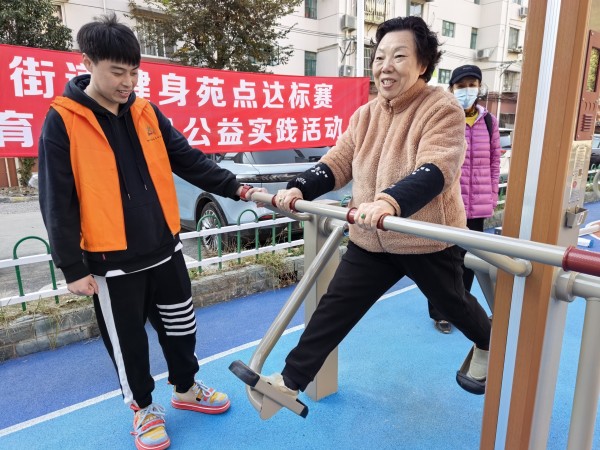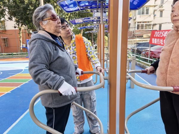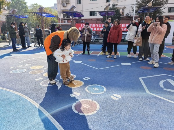 培训一结束,体育指导员们随既投入了居民健身指导实践,面对面、手把手地指导居民正确使用各类健身器材。帮助使用太空漫步机的阿姨调整姿势,提醒双脚踩满踏板、控制摆动幅度;指导使用扭腰器的居民双手紧握扶手、收紧核心肌群、控制旋转速度,避免运动损伤;同时还耐心引导小朋友规范参与跳房子等场地游戏。