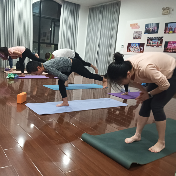 随着课程的推进,教练开始引入一些难度稍高但针对性更强的体式,以进一步改善白领们的身体状况。比如三角扭转式,有助于增强脊柱的灵活性,缓解久坐导致的腰背僵硬;战士二式,能够强化腿部和核心力量,提升身体的稳定性。在学员们尝试这些新体式时,教练会在一旁密切观察,给予及时的鼓励和精准的指导。当学员成功完成一个较难的动作时,教练会带头鼓掌,让大家感受到成就感。
