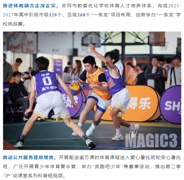 提供优质青少年体育公共服务,制定青少年体育活动促进计划,做优做实青少年体育夏令营、暑期社区青少年体育配送,丰富爱心暑托班体育课程内容,扩大覆盖面。推动市青少年体育协会建设,搭建青少年体育社会组织服务平台,做大青少年运动生活嘉年华。加强青少年科学健身指导,举办上海市金牌小解说选拔大赛,积极组队参加全国夏冬两季青少年阳光体育大会。夯实体育后备人才培养阵地,规范实施青少年运动员注册工作,会同教育部门完善“一条龙”学校课余训练研训机制,加强专项督导和教练员培训。发挥青少年赛事综合引领作用,高标准办好上海市第十八届运动会,吸引更多青少年参与,选拔优秀体育人才。持续优化青少年体育精英系列赛、锦标赛、冠军赛等重点赛事,做大做强MAGIC3上海市青少年三对三超级篮球赛、青少年体育俱乐部联赛、少儿体育联赛等品牌赛事,推进青少年赛事数字化转型。加强重点项目人才体系建设,强化三大球、田径、游泳等项目后备人才布局,积极做好全国青少年三大球运动会、全国青少年田径运动会组队参赛工作。加快推进市区两级足球青训中心建设。