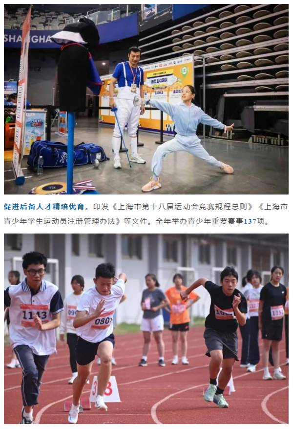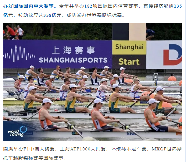 杨浦区和宝山区入选全国促进体育消费和赛事经济试点城市。崇明东滩入选首批全国高质量户外运动目的地建设地区名单。上海国际赛事文化及体育用品博览会扩容升级。制定《上海市体育局系统无形资产开发工作管理办法(试行)》。