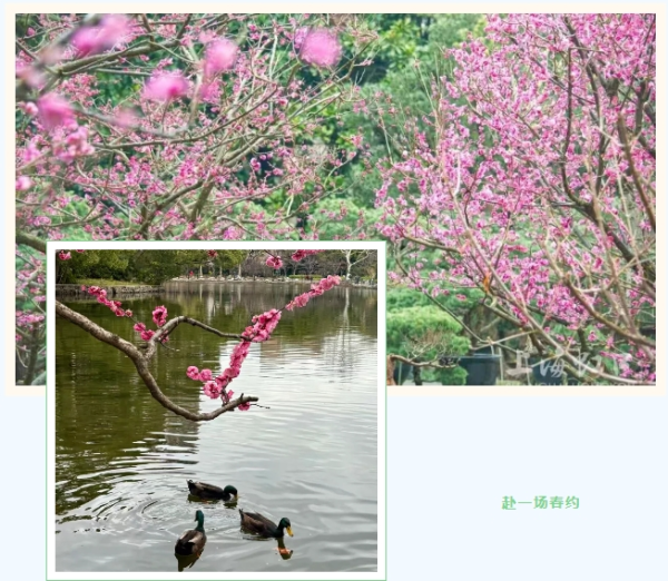 花,捕捉到了春天到来的消息,次第在枝头盛放。喜欢赏花的你一定不能错过鲁迅公园。近期,鲁迅公园的梅园已免费向公众开放。虽然已经过了盛花期,但还能捕捉到一些傲立枝头的粉色。此外,园内还有其他品种的花朵正在开放。不久之后,樱花季即将开始,虹口足球场又会飘起一朵朵“粉云”。