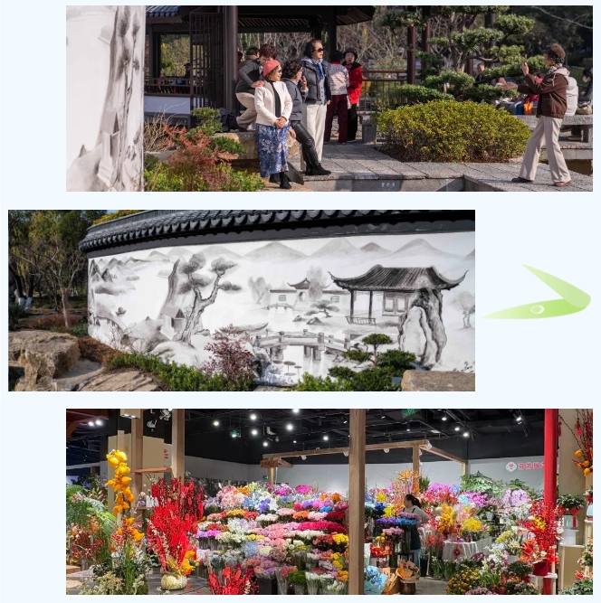 公园内草坪翠绿、新芽萌发,还有盛放的花木点缀。慢慢逛、不赶时间,捕捉枝叶上的翠绿光影、草坪上的鲜绿肌理,感受自然的清新与松弛。随后步行直达月亮湾,这里绿植环绕、氛围慵懒,就像一个活力四射的花园。宝藏打卡地“蔚冉生长花鸟市”里既有各色花植也有小众宠物,仿佛闯入都市小森林。若想解锁饮食购物,与月亮湾相通的太阳宫汇聚了丰富业态,既有大众高性价比品牌,也有各类特色餐饮,满足不同口味。这条路线全程轻松无负担,主打一个松弛感。